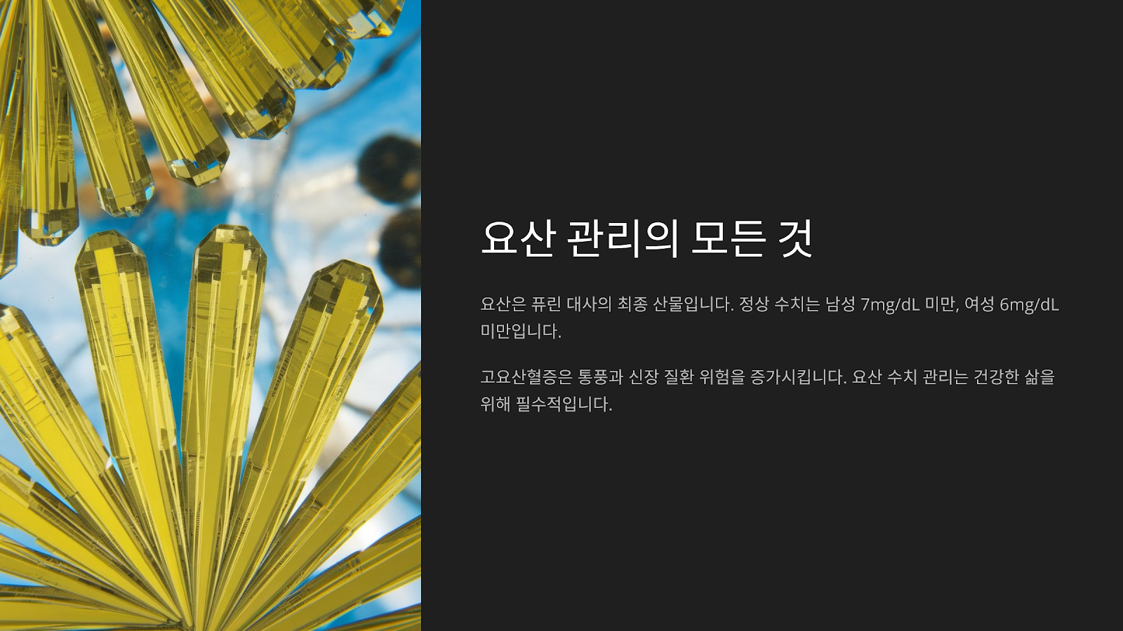 요산 수치를 낮추려면 올바른 식습관과 생활 습관이 필수예요! 😊 지금부터 건강한 습관을 실천해서 통풍과 요산 문제를 예방해보세요! 💪